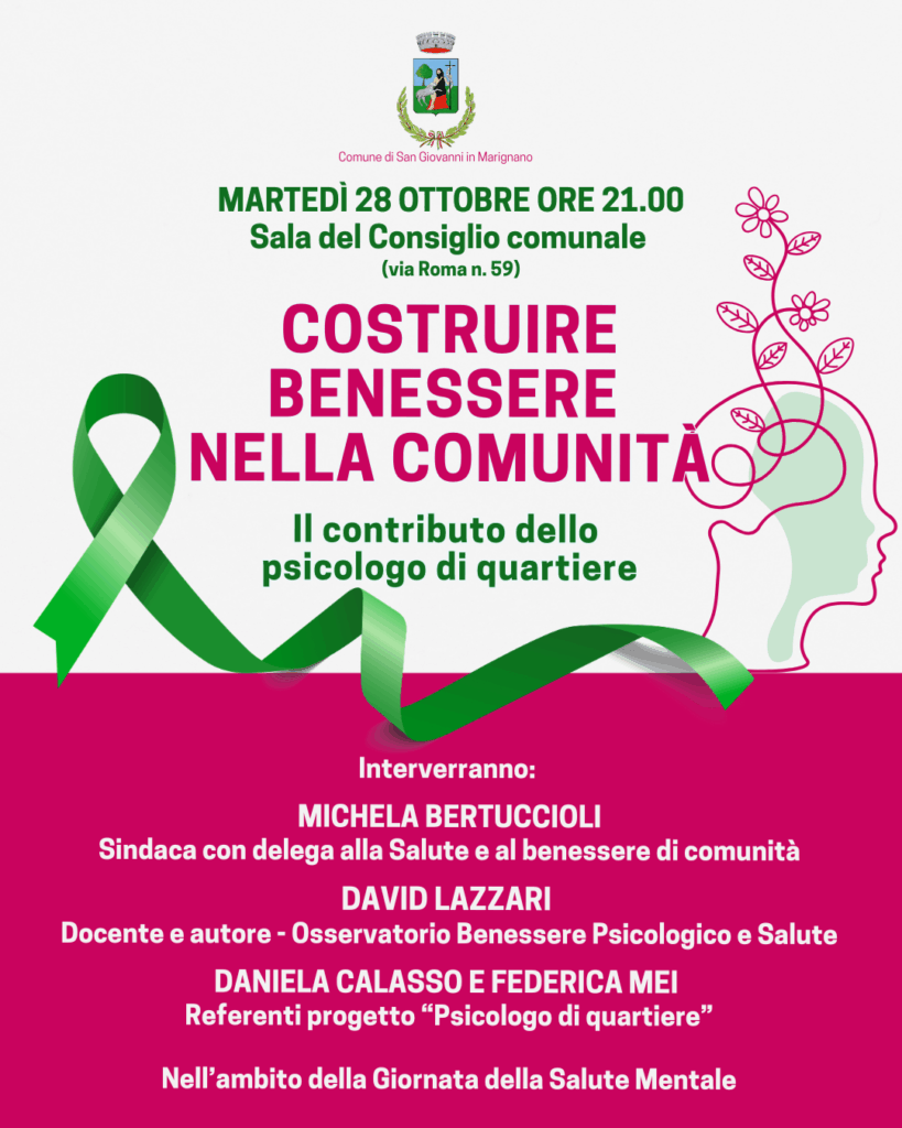 Il Comune di San Giovanni in Marignano, in qualità di ente capofila per tutti i comuni del distretto, presenterà l’andamento di questo servizio, in una conversazione aperta tra la Sindaca Michela Bertuccioli con delega alla Salute e Benessere di Comunità, le dottoresse che curano il progetto e il Dott. David Lazzari, psicologo, autore, già Presidente dell’Ordine Nazionale degli Psicologi e proponente dell’Osservatorio sul Benessere Psicologico e Salute.