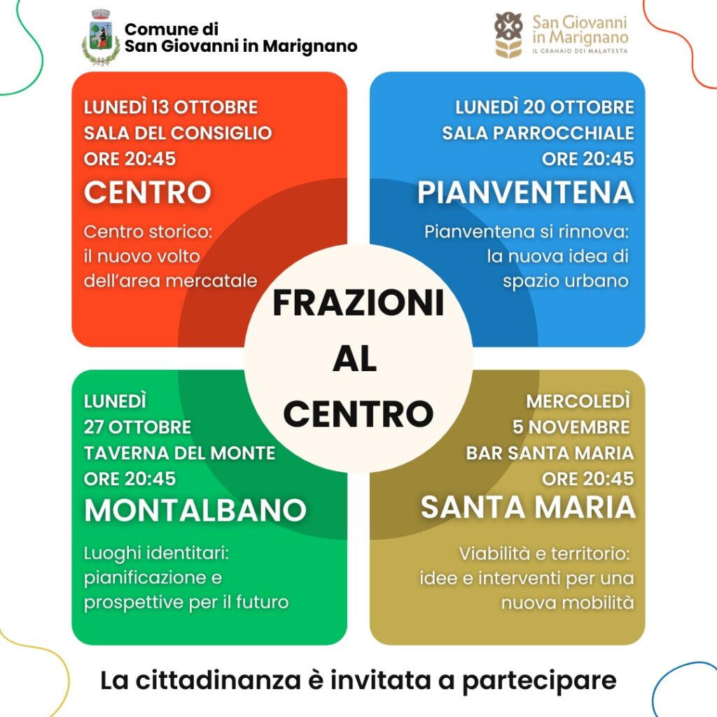 L’iniziativa, intitolata Frazioni al centro. Per una visione comune di San Giovanni in Marignano, è nata con l’obiettivo di valorizzare ogni luogo del territorio, promuovendo un dialogo diretto con i residenti che lo vivono e abitano sui temi di pianificazione urbana, viabilità, servizi e qualità della vita.