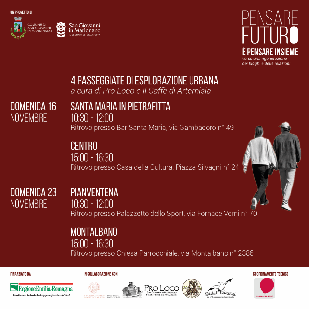 “Pensare Futuro è Pensare Insieme. Verso una rigenerazione dei luoghi e delle relazioni” prosegue con 4 passeggiate, organizzate con il contributo di Pro Loco e Il Caffè di Artemisia, per esplorare San Giovanni in Marignano in lungo e in largo: camminando scopriremo le frazioni, i luoghi del cuore dei cittadini e delle cittadine marignanesi e le storie che hanno da raccontarci!
