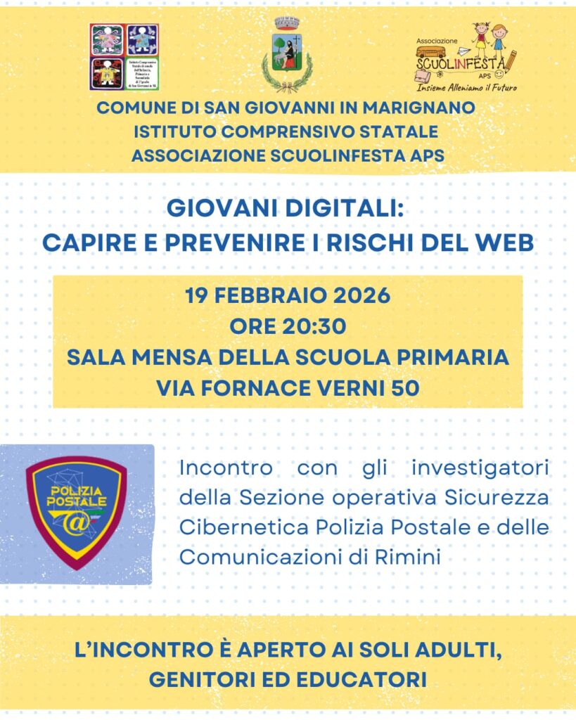 In un’epoca in cui la vita digitale dei minori è sempre più precoce e complessa, la prevenzione diventa uno strumento indispensabile. Con questo obiettivo, gli investigatori della Sezione Operativa Sicurezza Cibernetica di Rimini, in collaborazione con il Comune di San Giovanni in Marignano, l’Istituto Comprensivo Statale e l’Associazione Scuolinfesta, hanno organizzato un incontro dedicato alla sicurezza in rete delle giovani generazioni. L’appuntamento, dal titolo Giovani digitali: capire e prevenire i rischi del web, si terrà giovedì 19 febbraio alle ore 20:30 presso la sala mensa della scuola primaria (via Fornace Verni, 50).